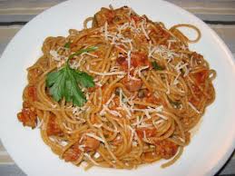 Top this mixture with the sausage-tomato sauce from the frying pan and mix well.  Serve with freshly grated Parmesan cheese and Italian bread.               Serves 4-6